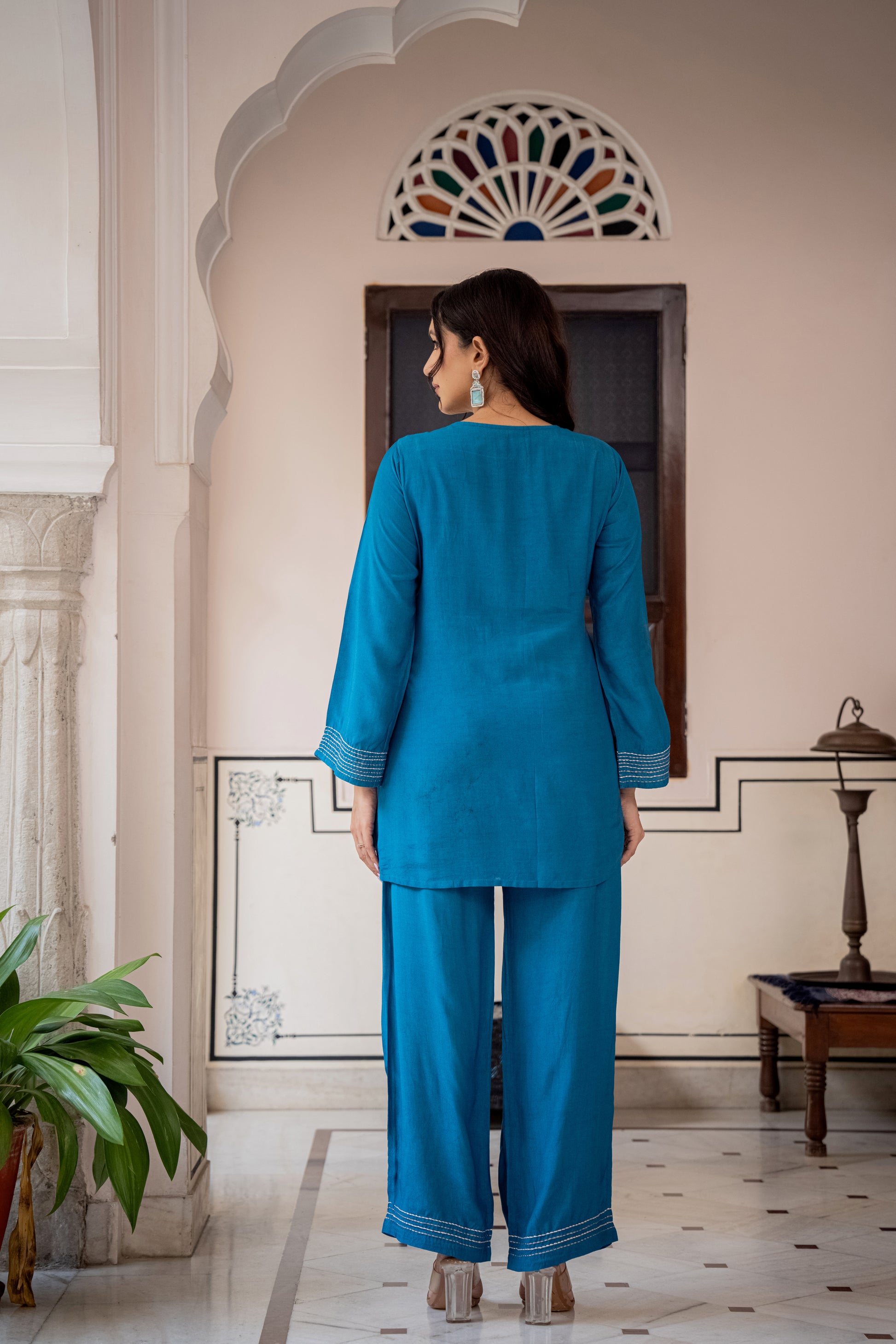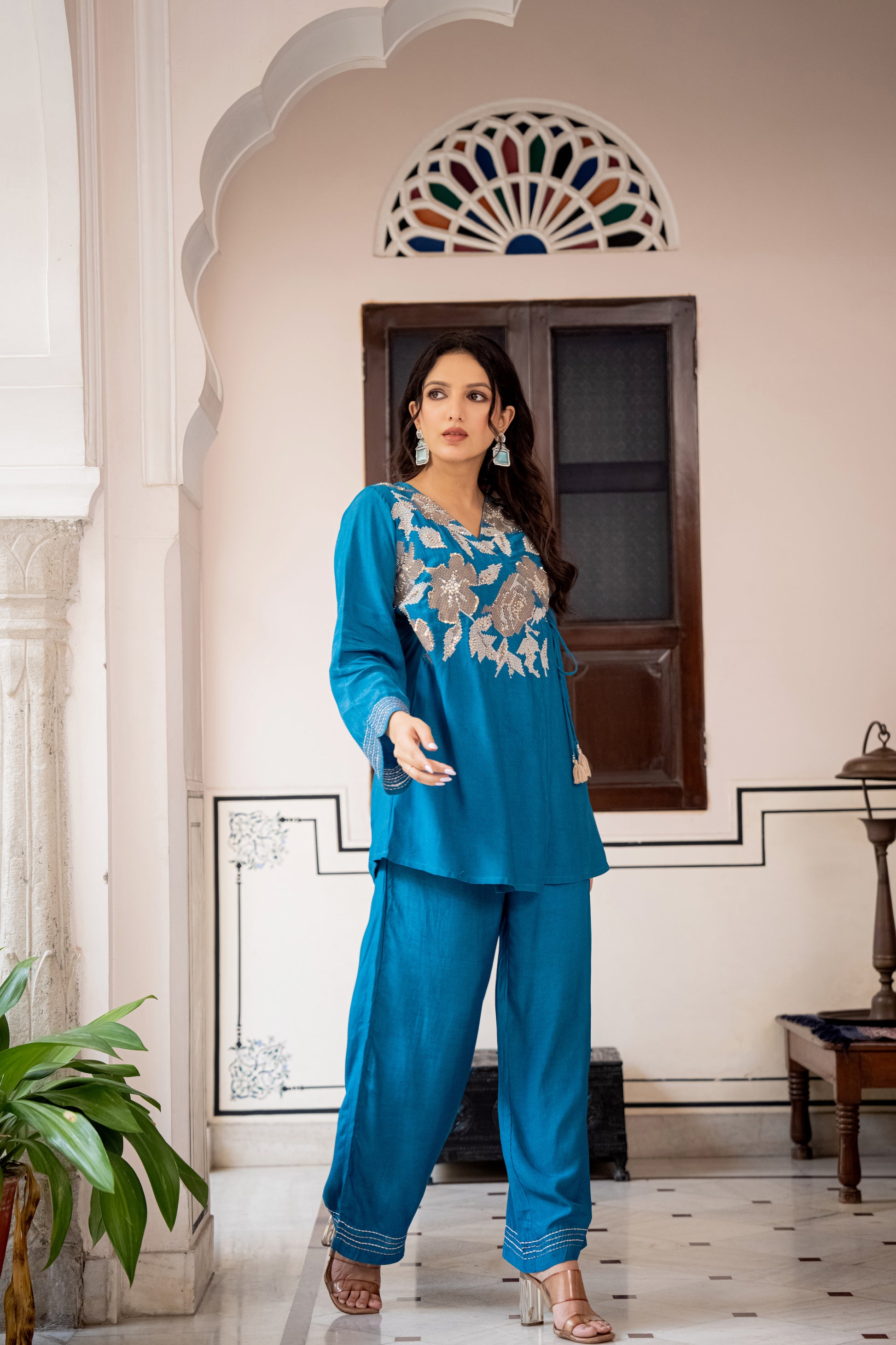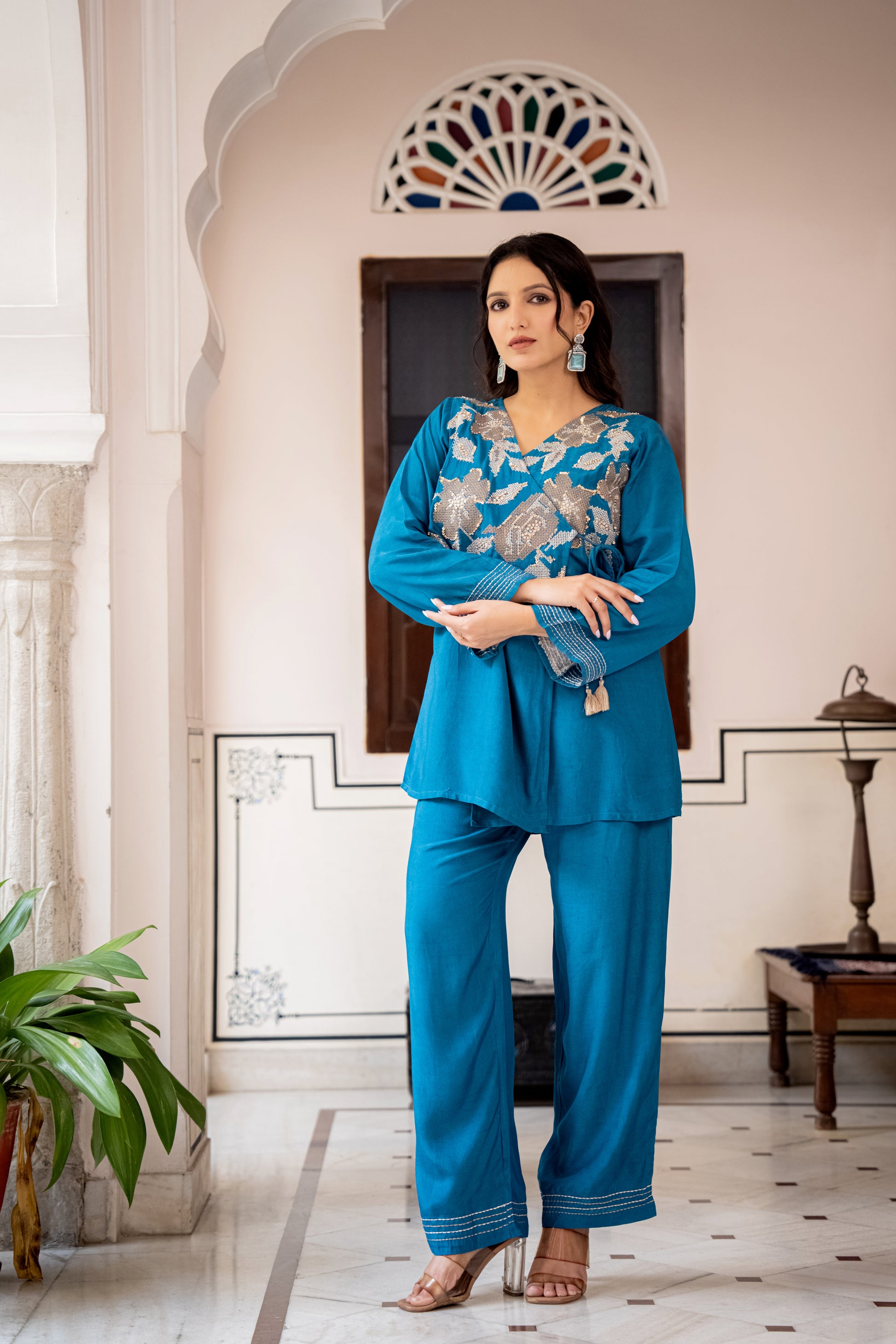 2-piece co-ord set crafted in soft Maslin fabric, featuring a blend of handwork and machine embroidery on the yoke. Designed for everyday comfort with a graceful touch, this teal outfit is perfect for casual outings or light festive occasions.