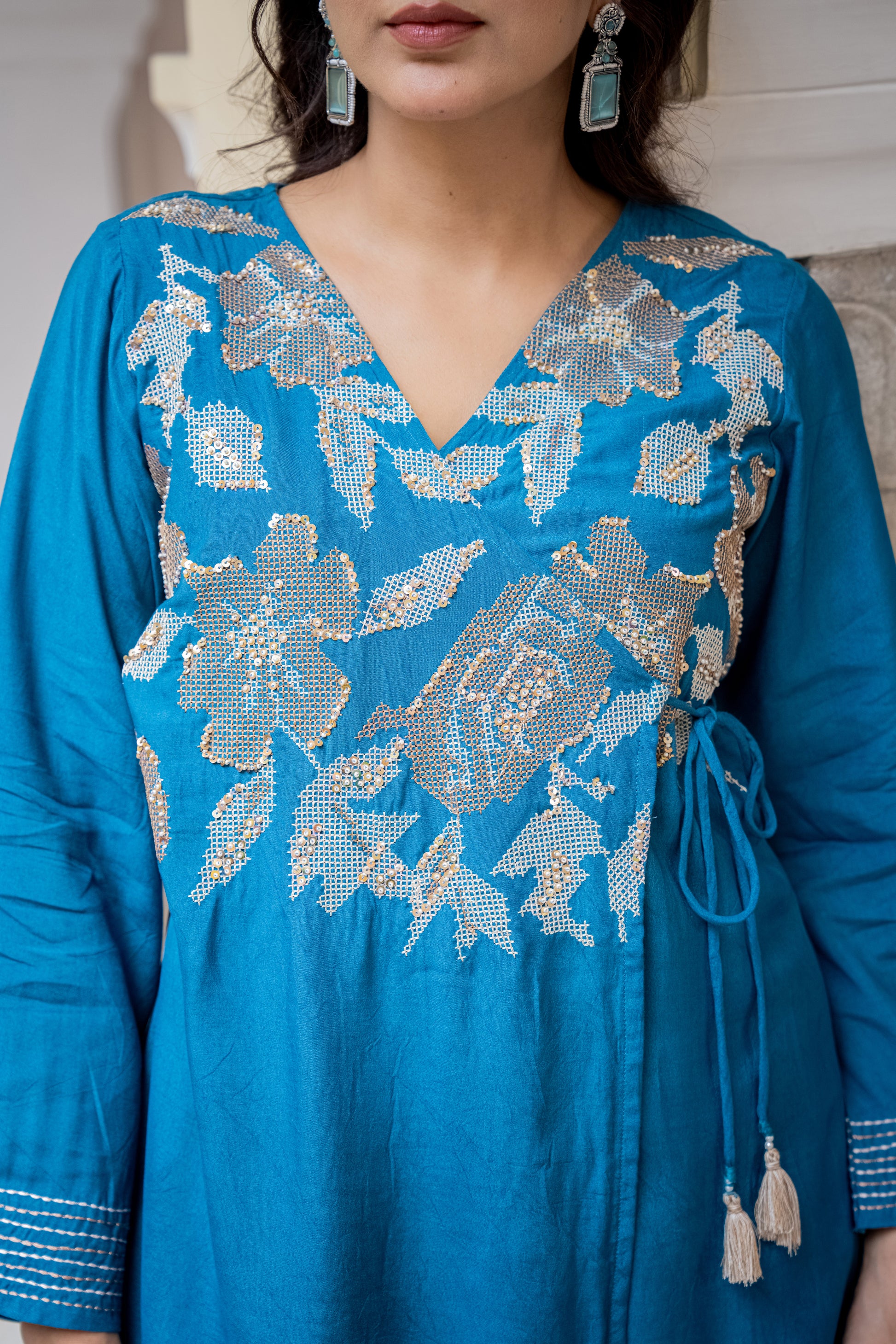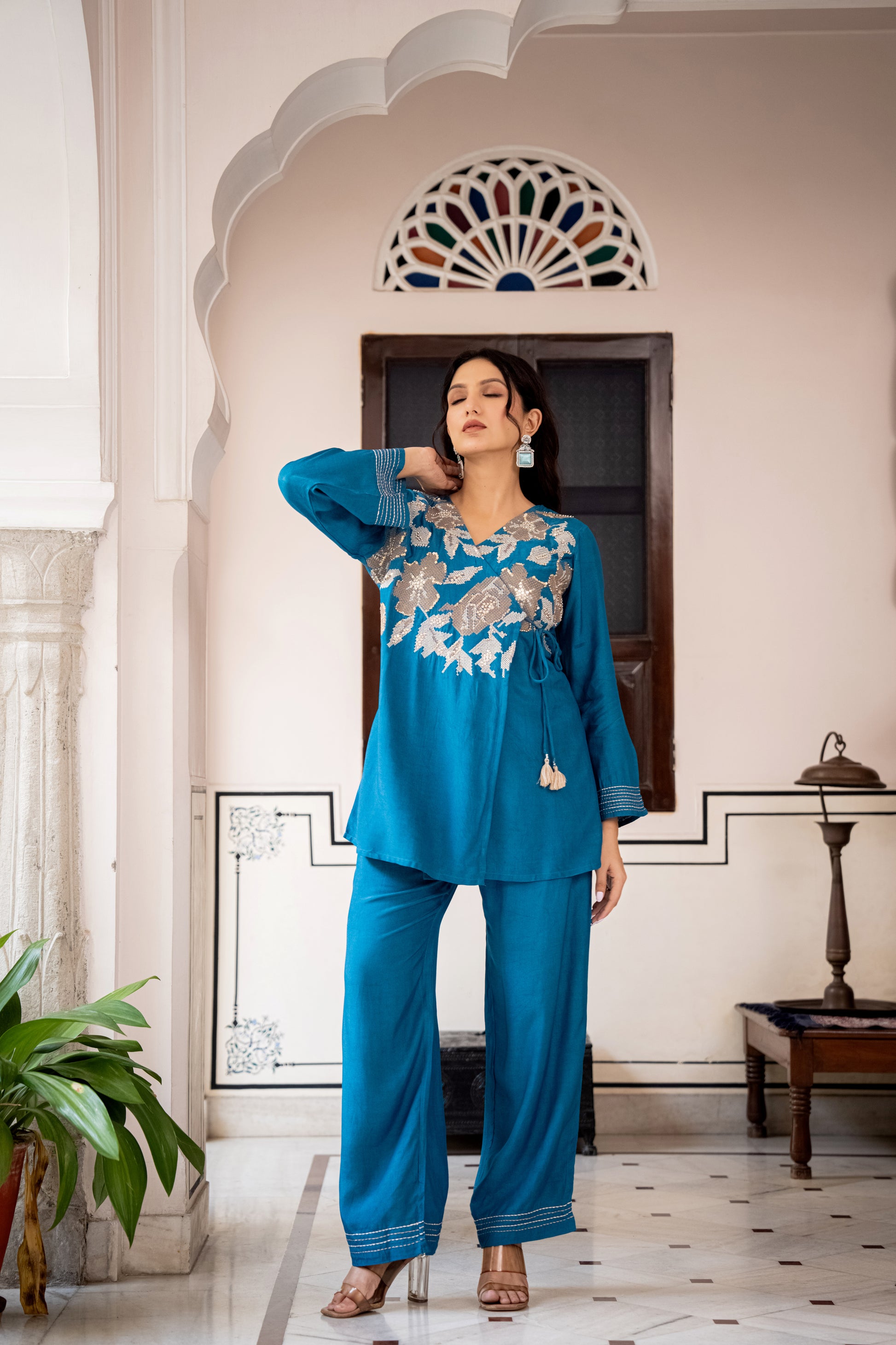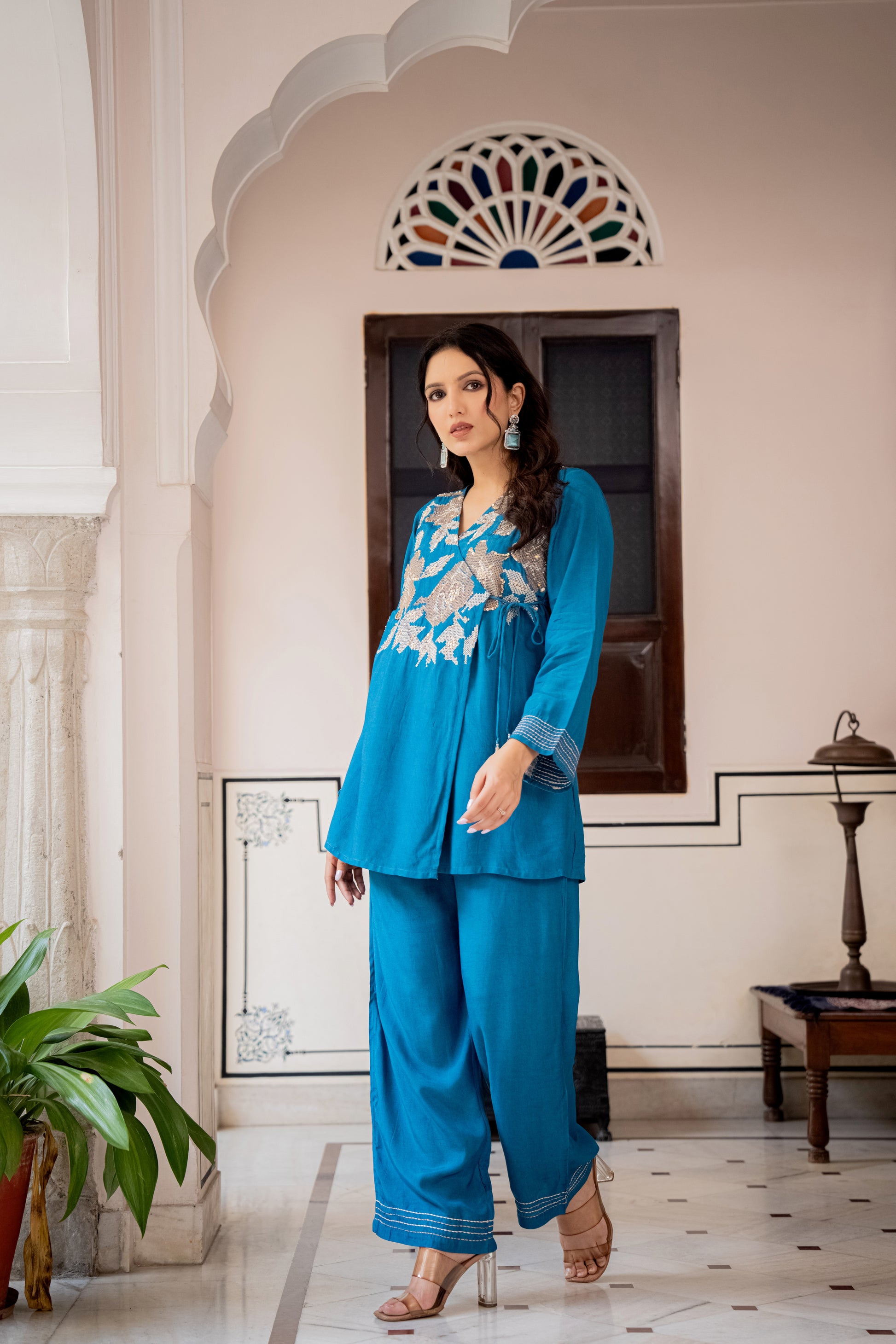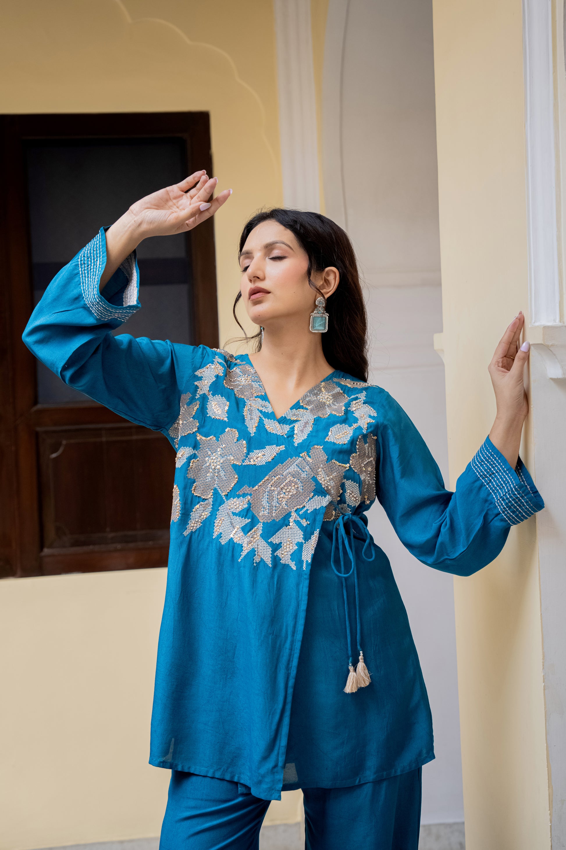 2-piece co-ord set crafted in soft Maslin fabric, featuring a blend of handwork and machine embroidery on the yoke. Designed for everyday comfort with a graceful touch, this teal outfit is perfect for casual outings or light festive occasions.