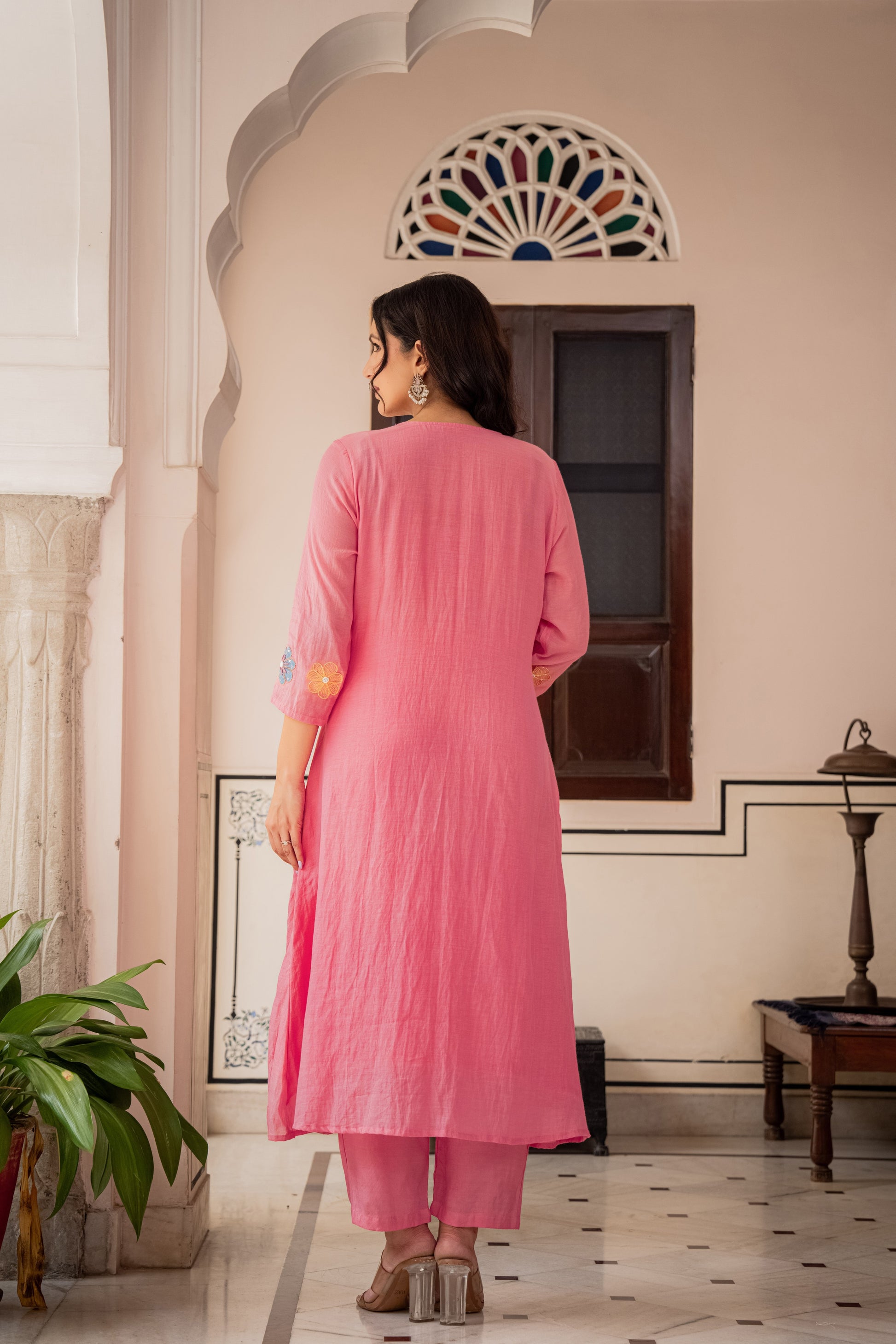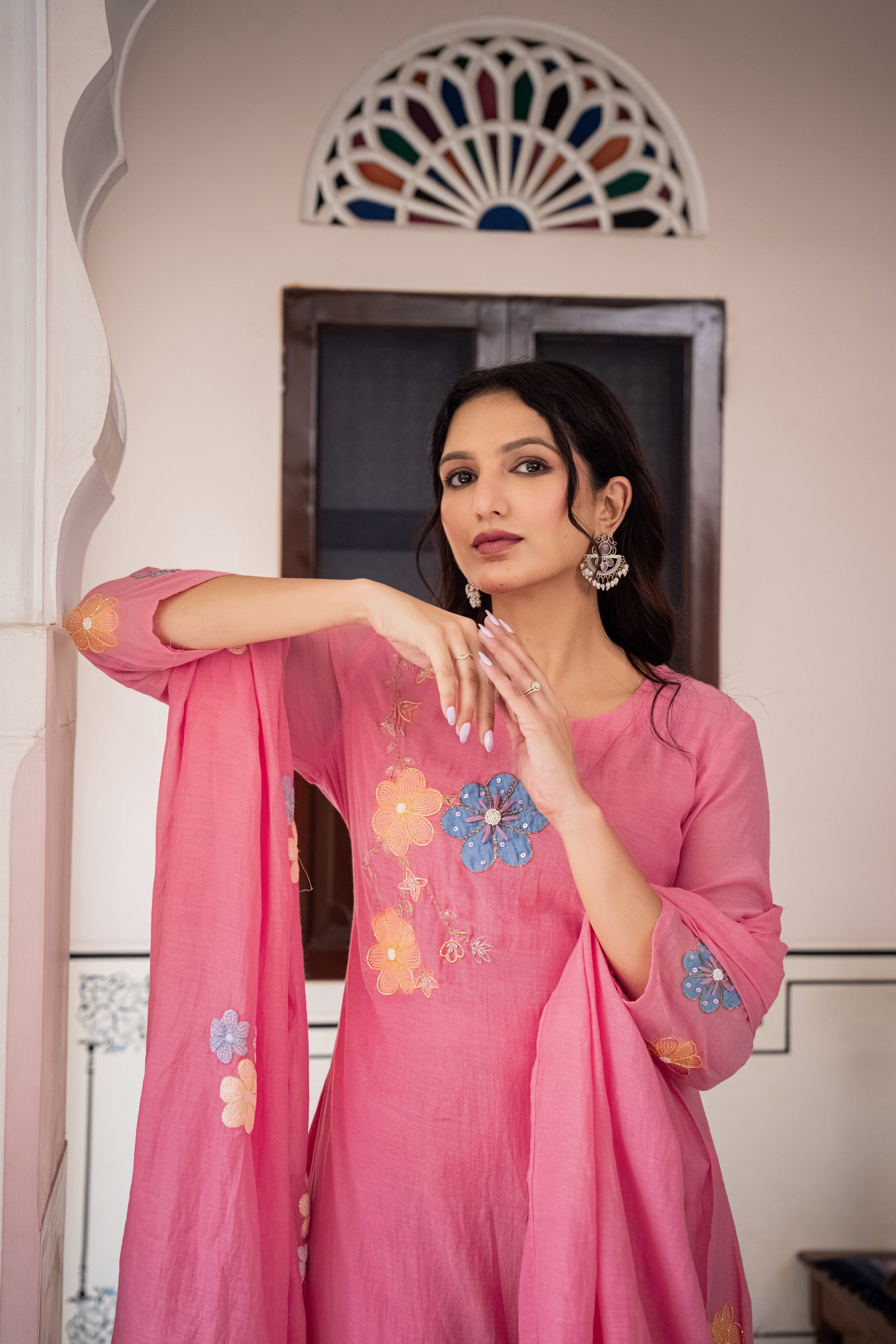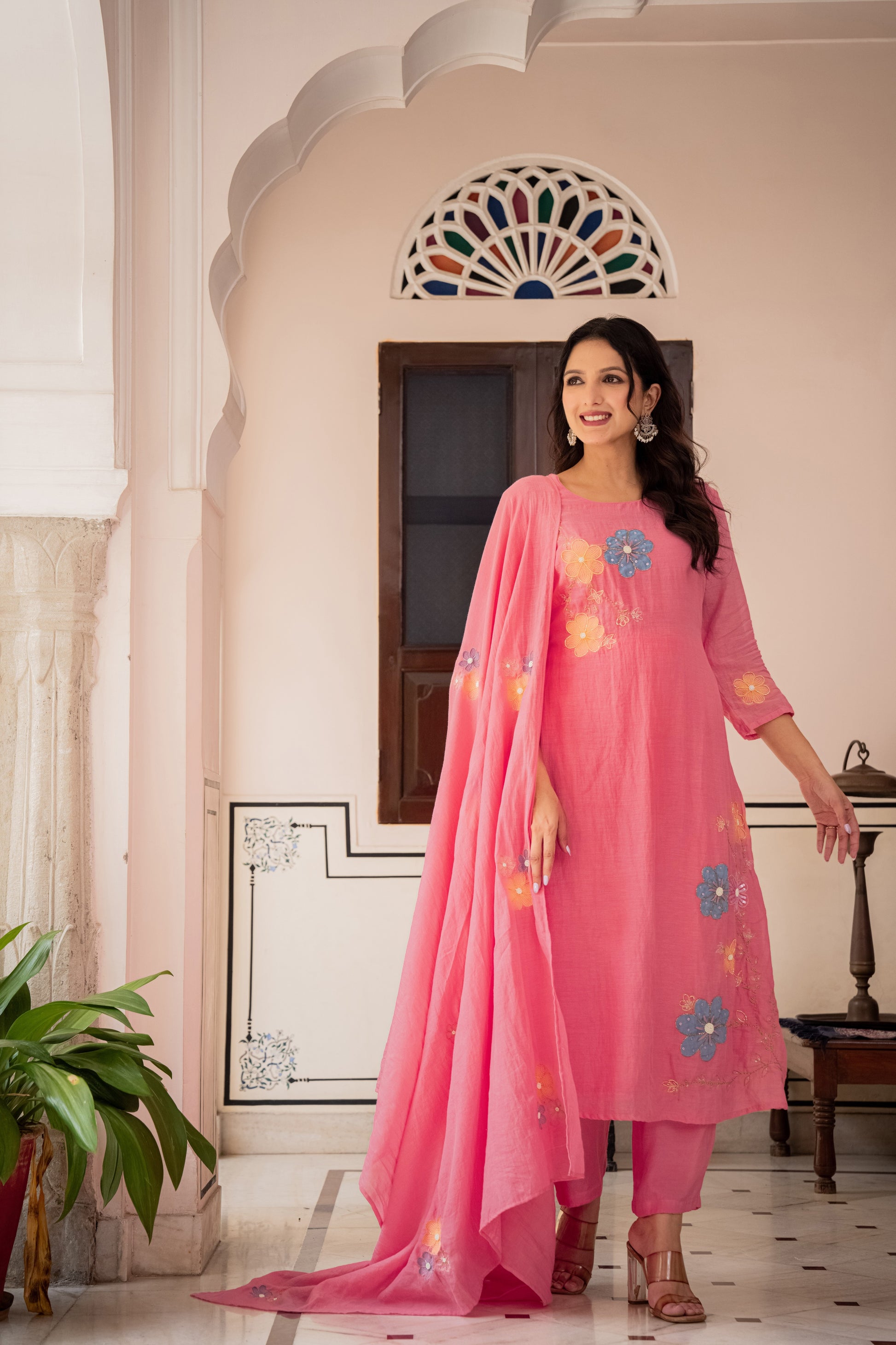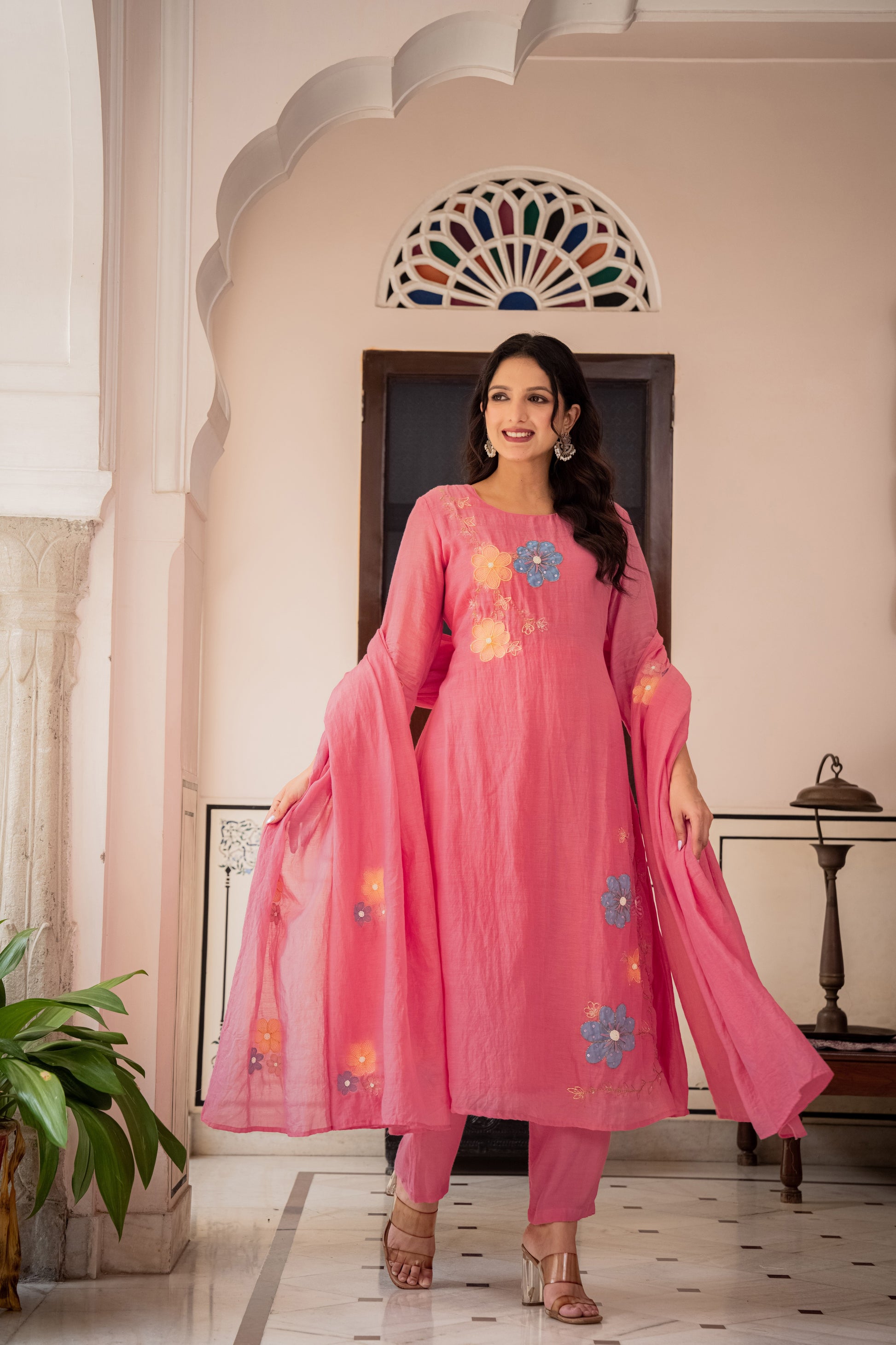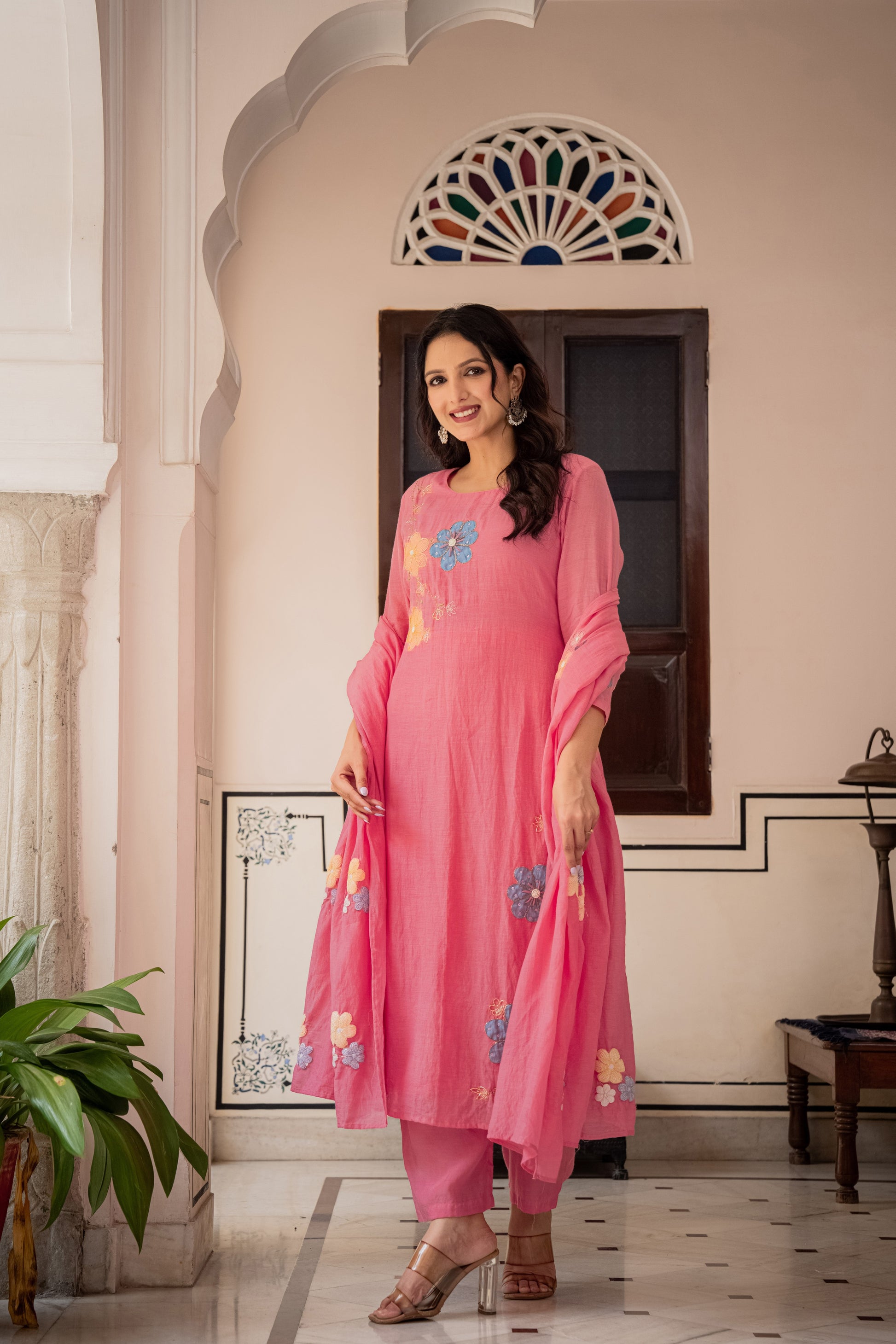 This powder Pink Banarasi Mul Chanderi A-line three-piece suit set.The kurta features hand embroidery with delicate appliqué detailing, paired with a sleek shantoon pant for effortless comfort. The look is elevated with a lightweight embroidered dupatta, adding fluidity and artisanal charm.