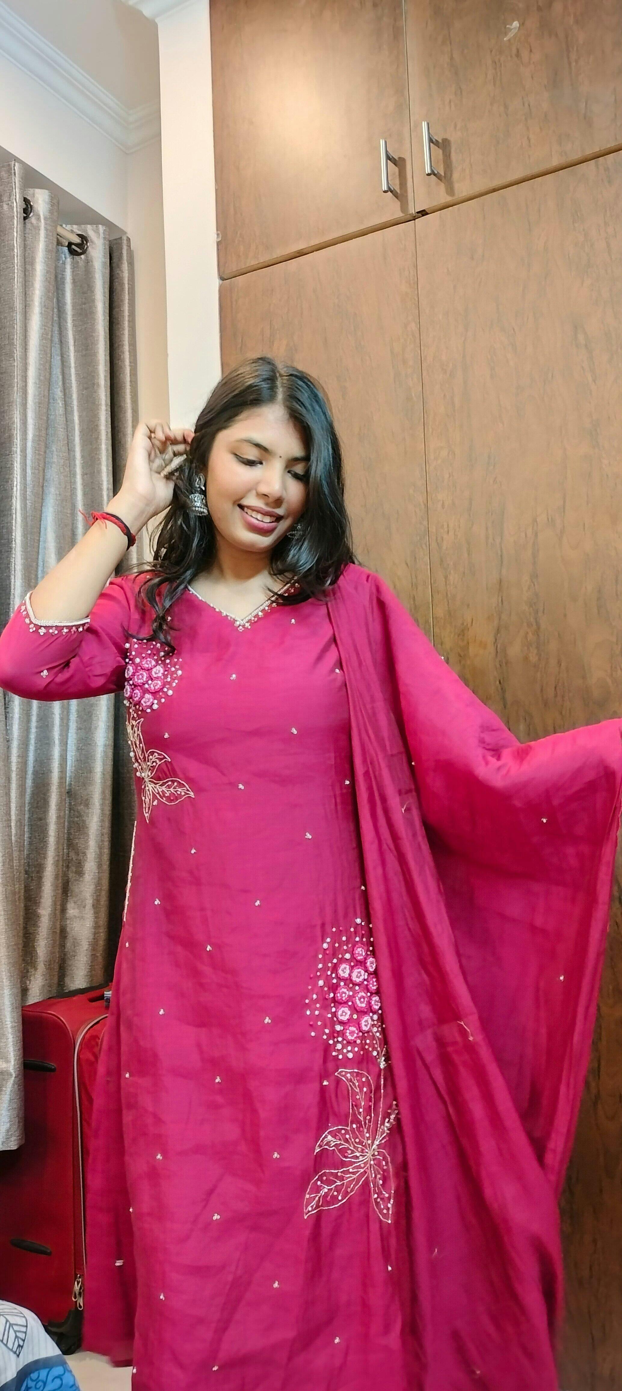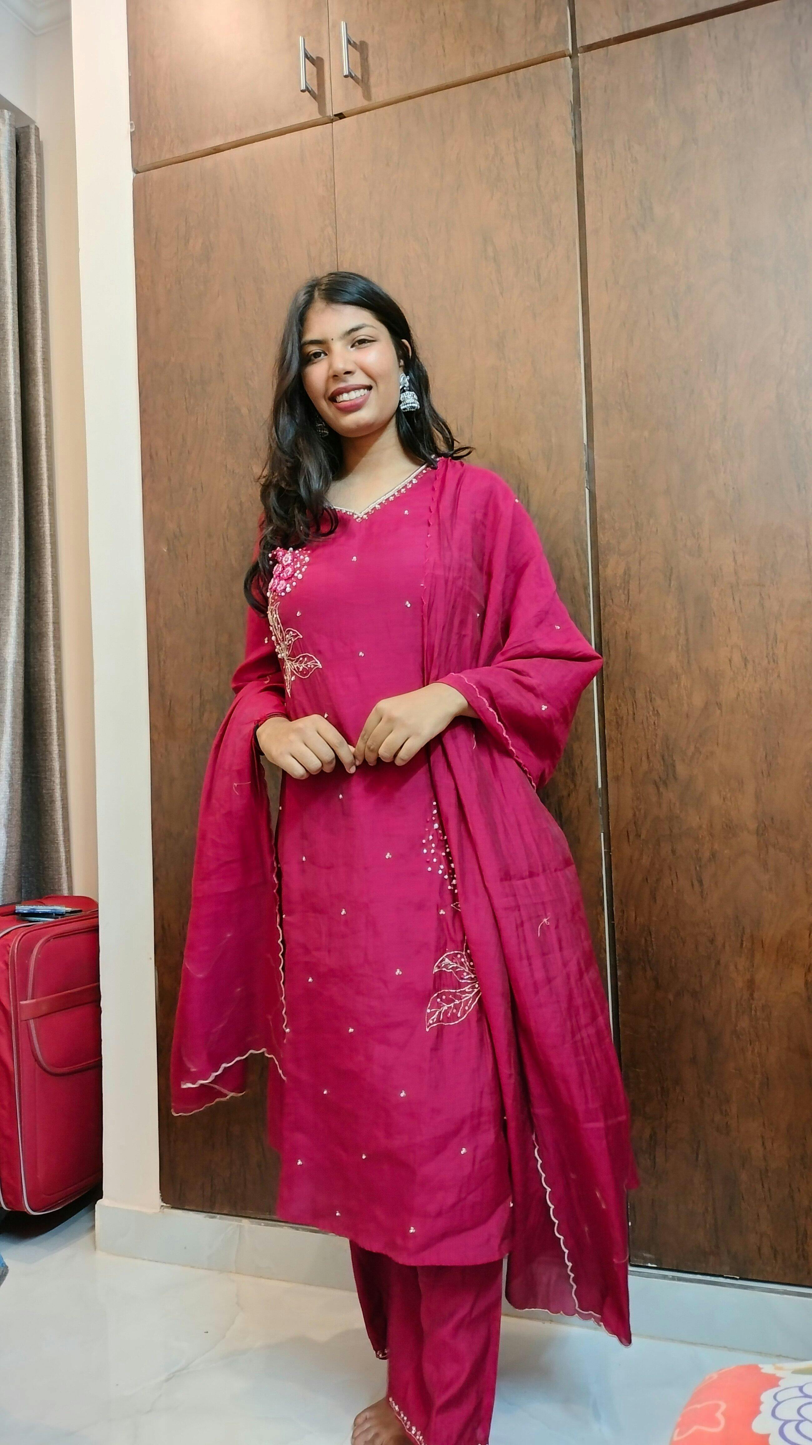 An elegant cherry pink three-piece suit featuring a finely embroidered kurta with bead-detailed V-neckline, scattered butis, and floral motifs. The kurta is designed with two functional side pockets for added ease. Paired with straight pants enhanced with subtle embroidery accents and a lightweight embroidered dupatta, this set beautifully balances festive charm with everyday comfort.