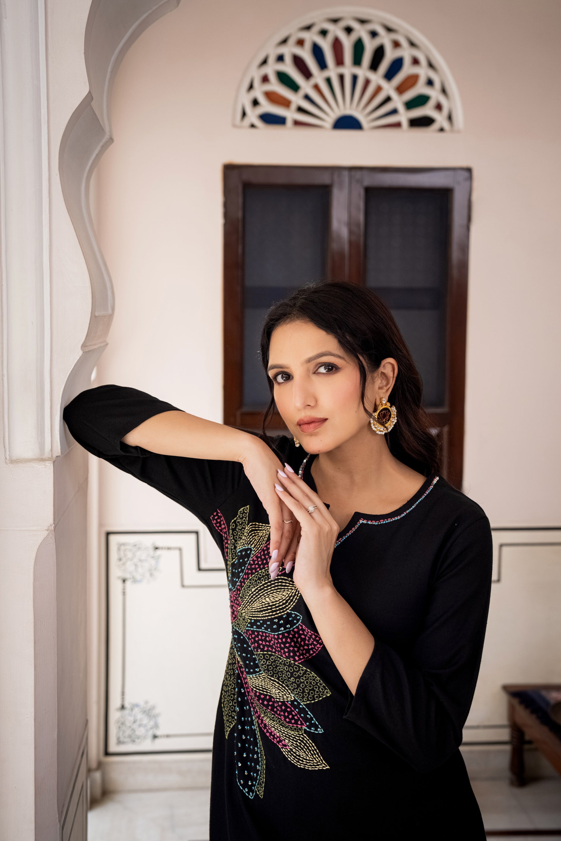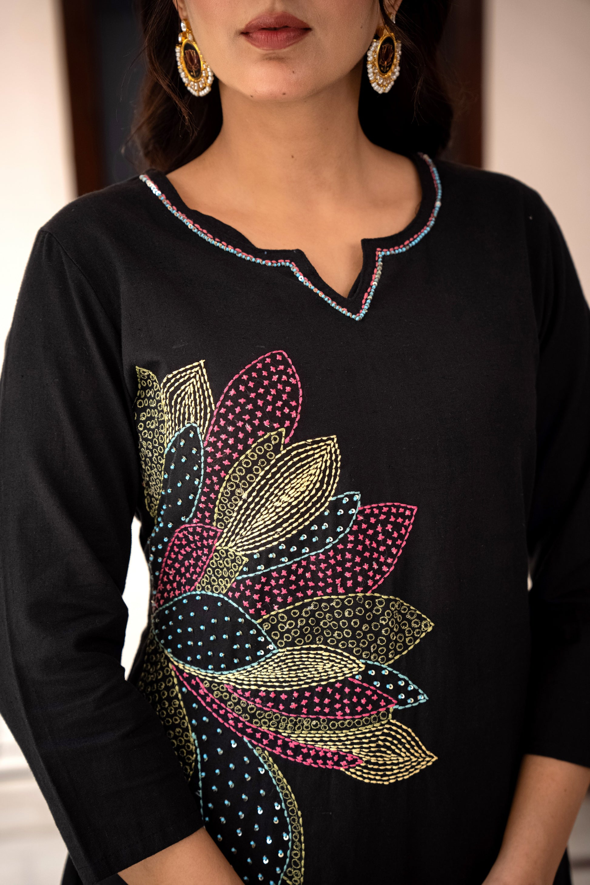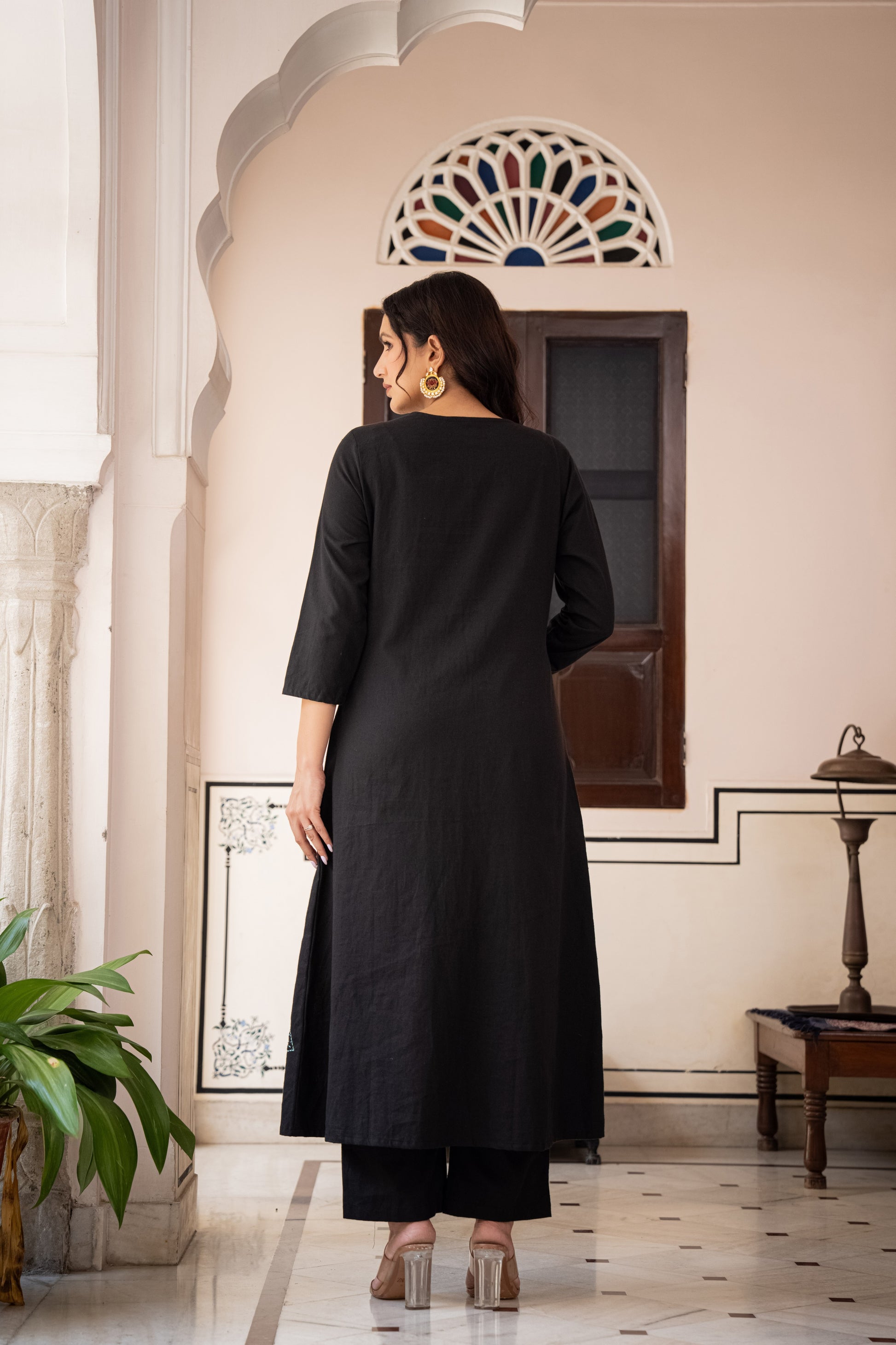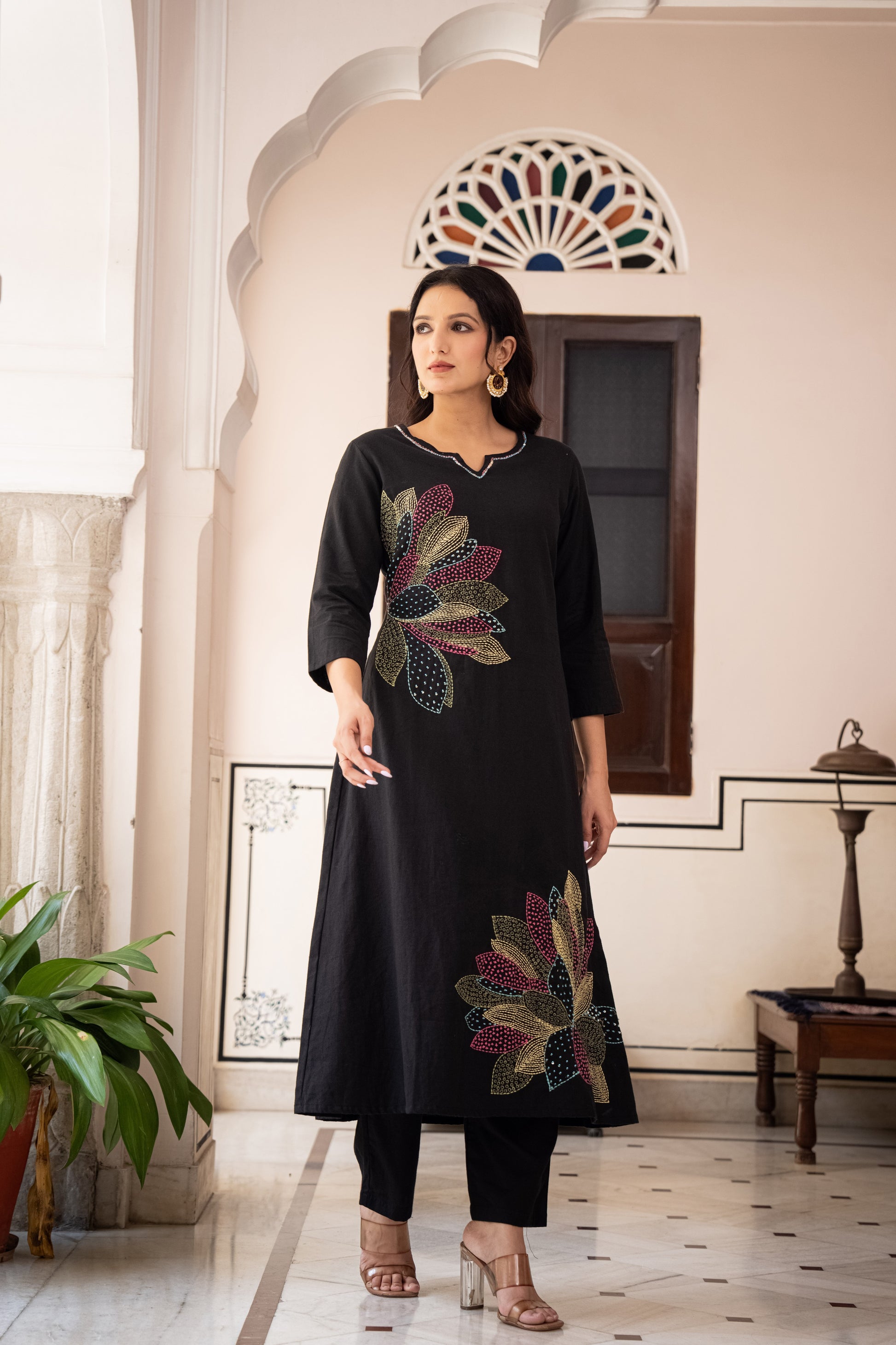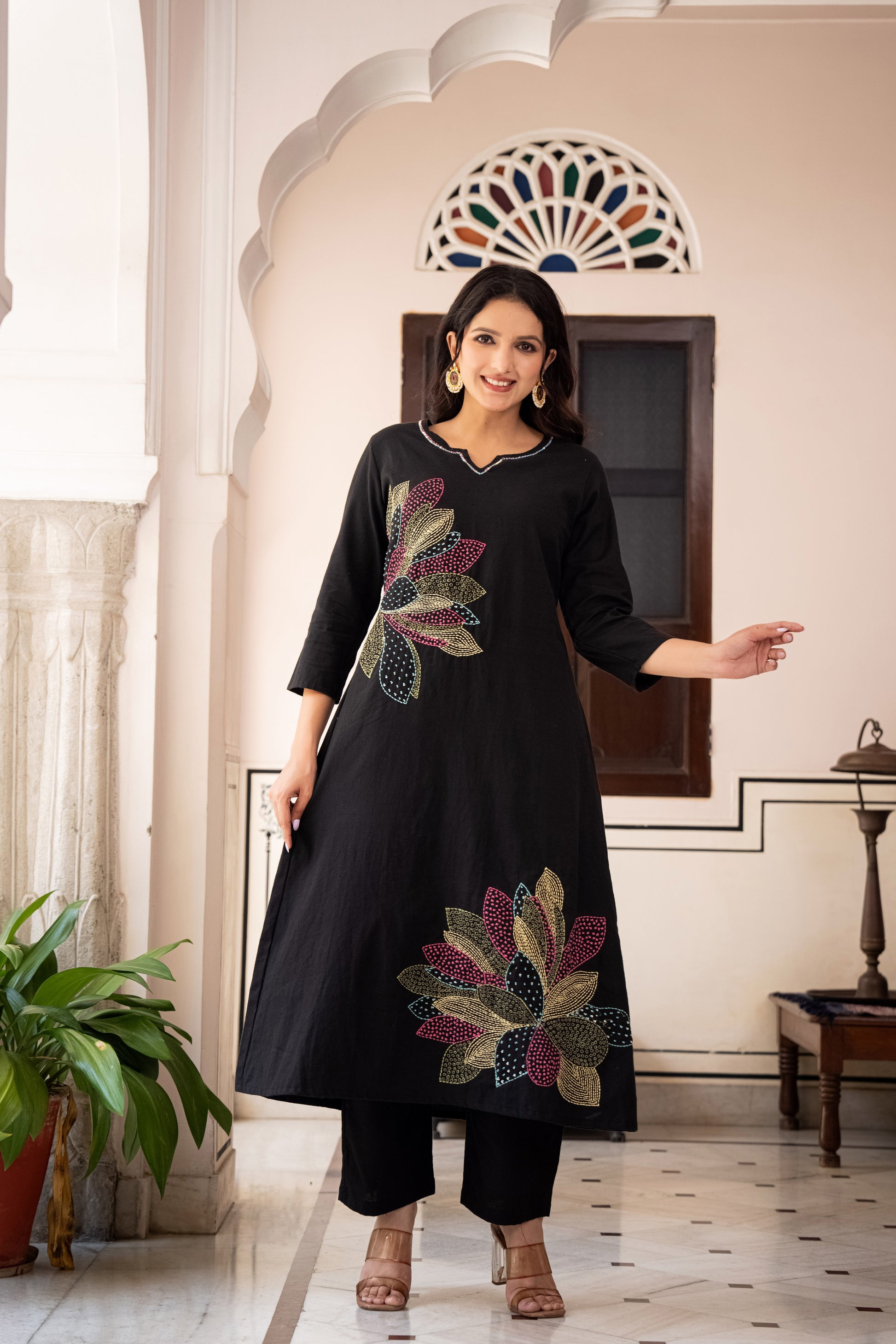 Elevate your style with this black A-line kurta set, featuring stunning traditional floral motif machine and hand embroidery, comfy elasticated pants- where heritage meets modern ease.