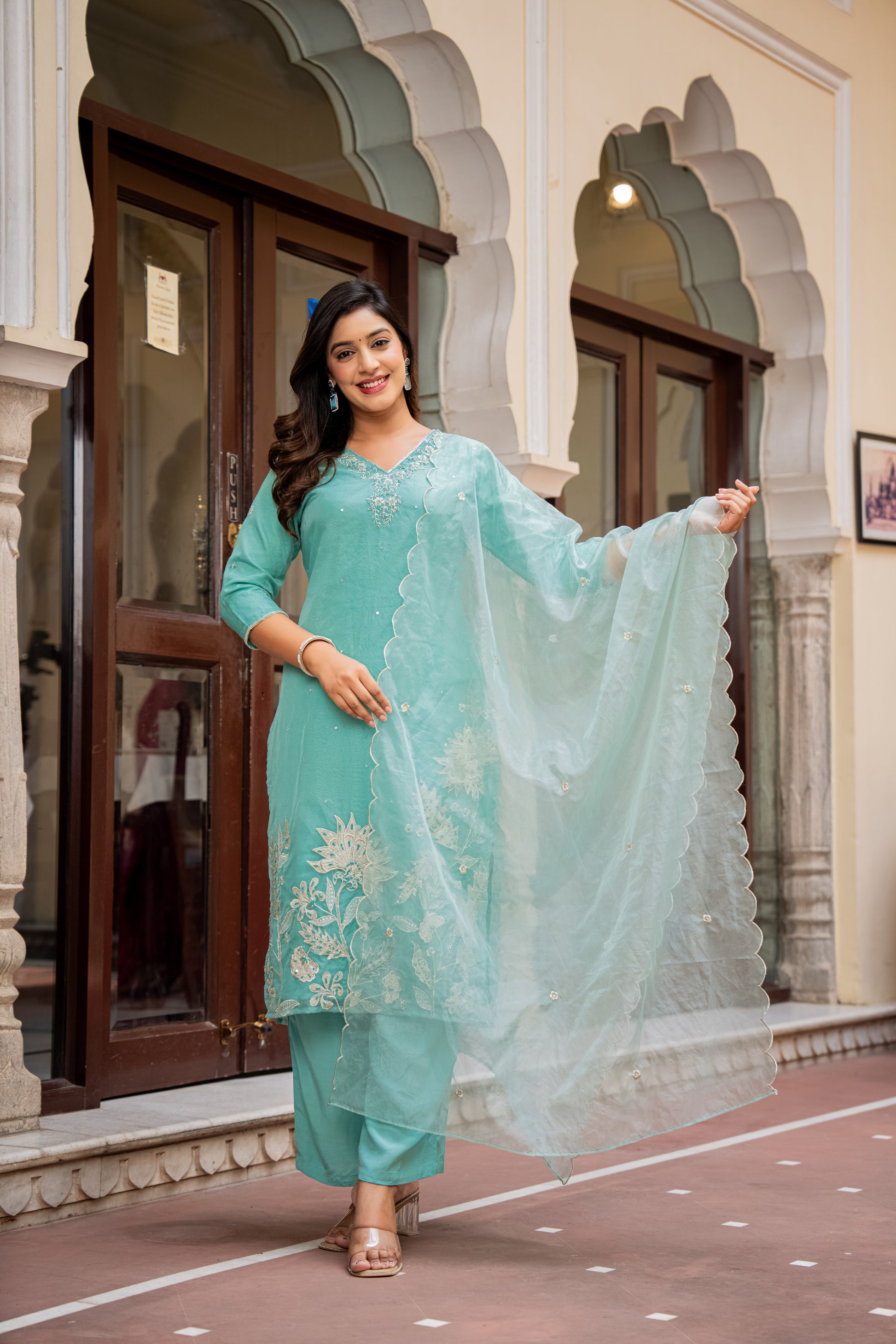A graceful fuchsia blue kurta set adorned with intricate zari and resham embroidery. The kurta features delicate floral motifs in silver threadwork on the neckline, sleeves, and hemline, enhanced with sequin highlights for a subtle festive shimmer.